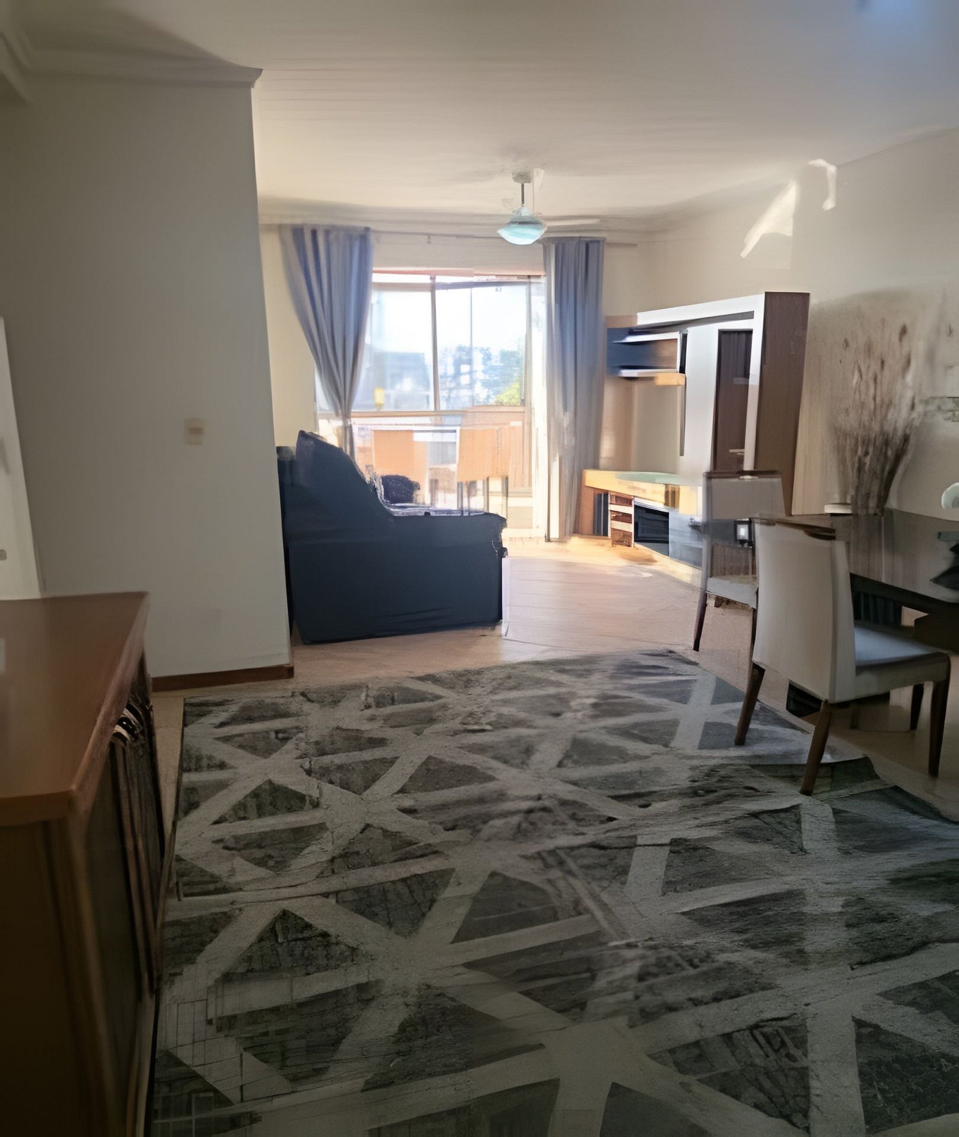 • Sala ampla, ventilada, com sofá, TV e ventilador de teto